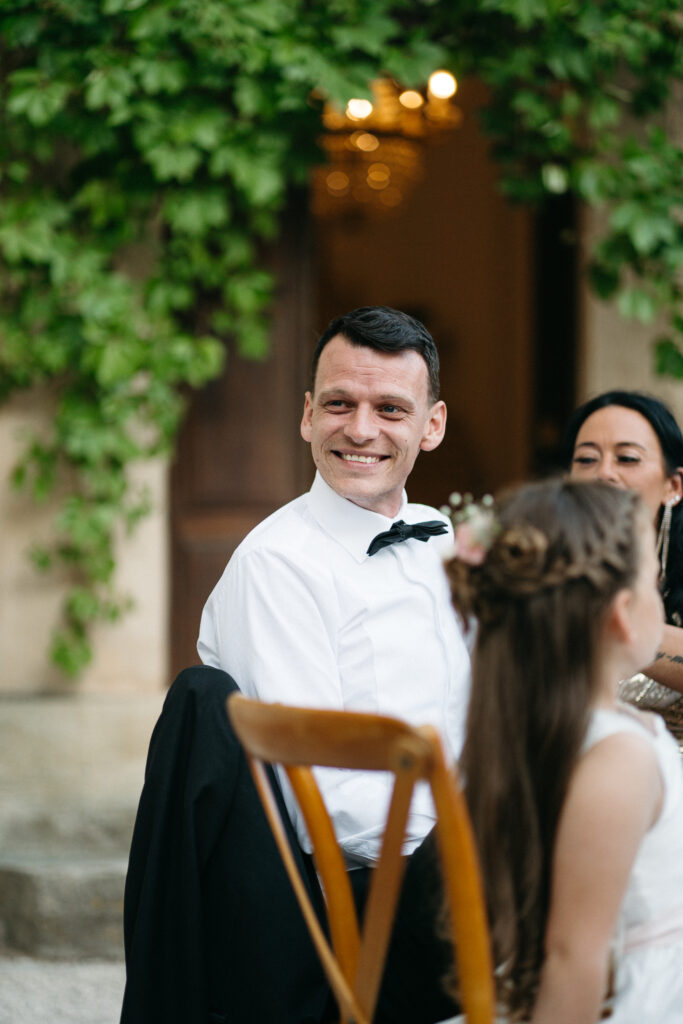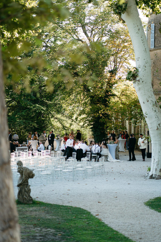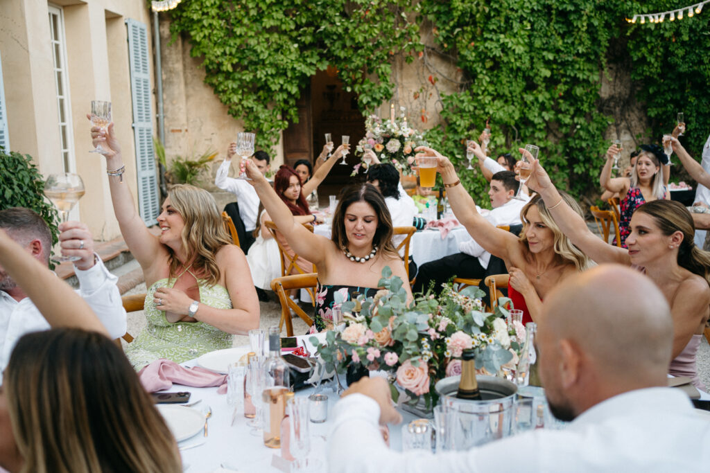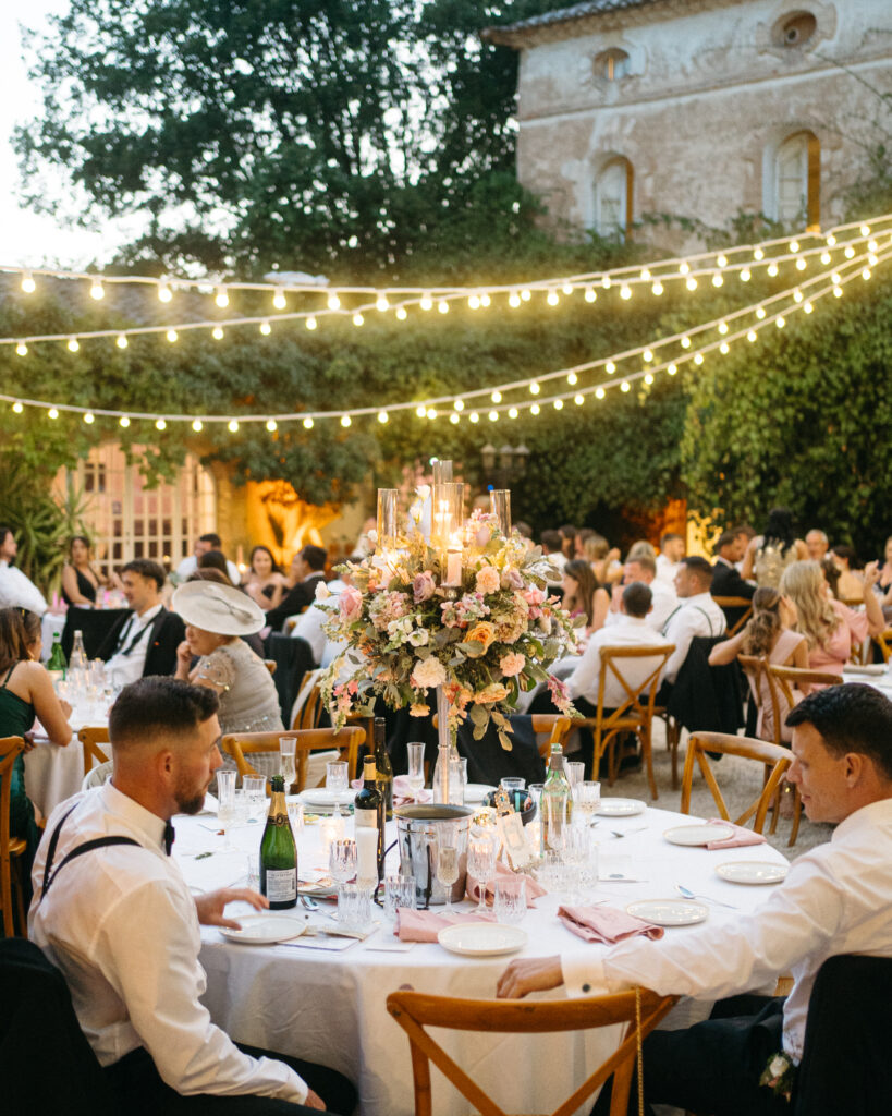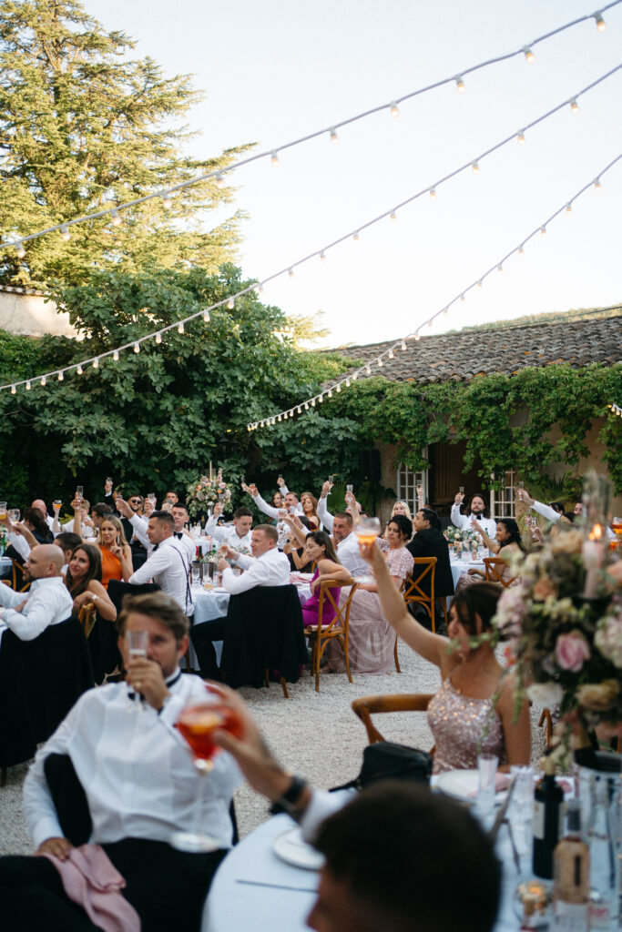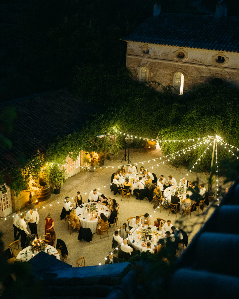 La journée a culminé avec un dîner somptueux sous le ciel étoilé de Provence. Les tables élégamment dressées, éclairées par des guirlandes lumineuses, ont créé une atmosphère intime et chaleureuse. Les convives ont savouré des mets délicieux tout en échangeant des rires et des anecdotes, tandis que le château en arrière-plan semblait veiller sur cette scène de bonheur partagé.