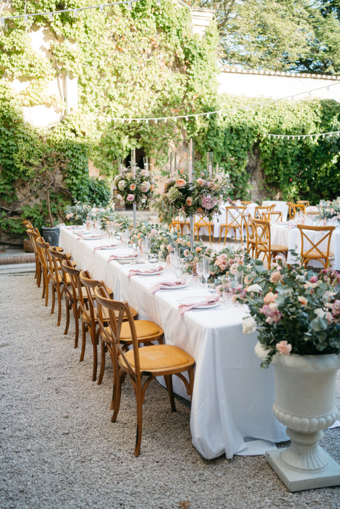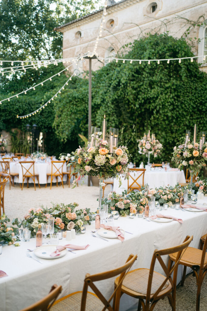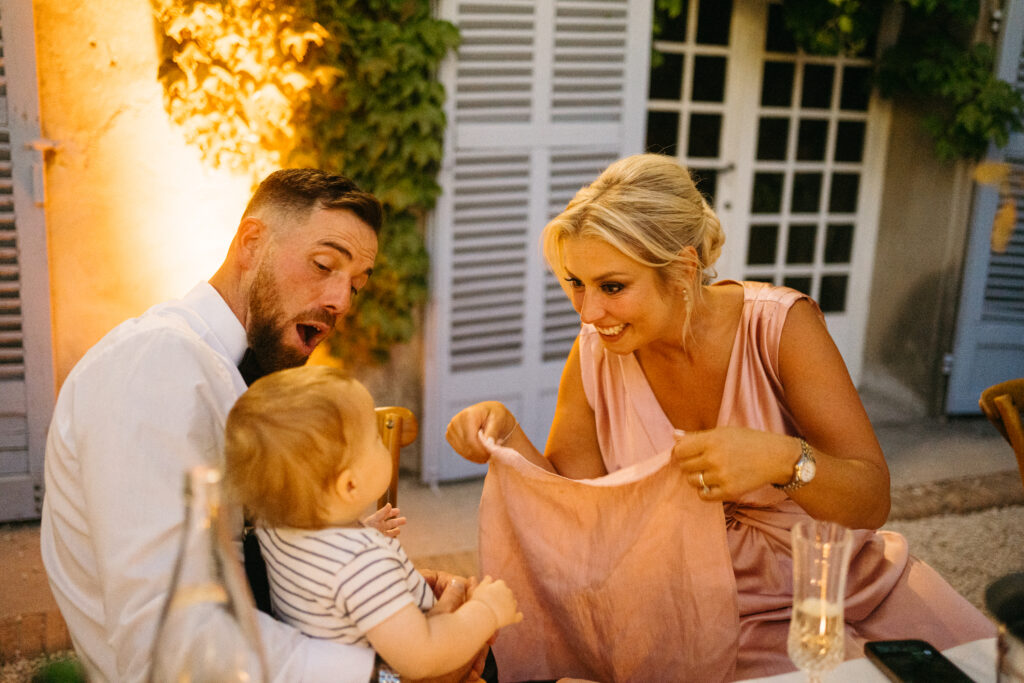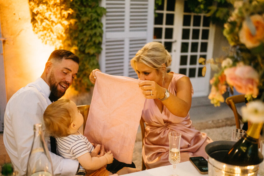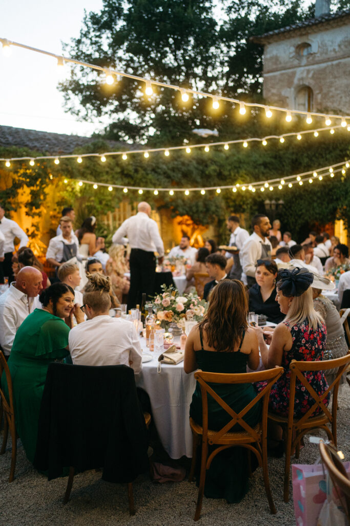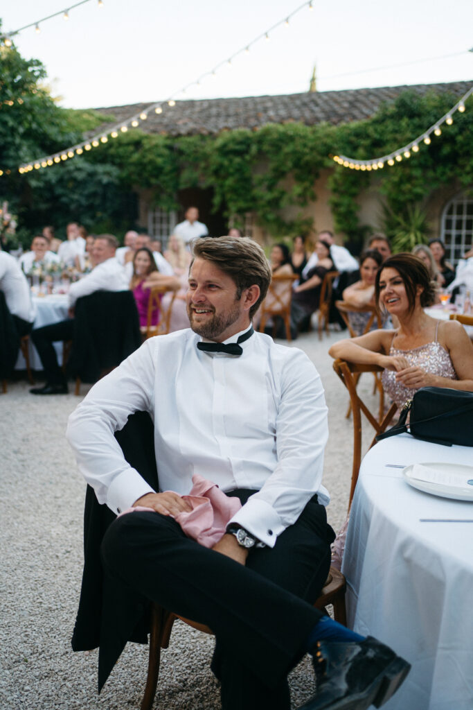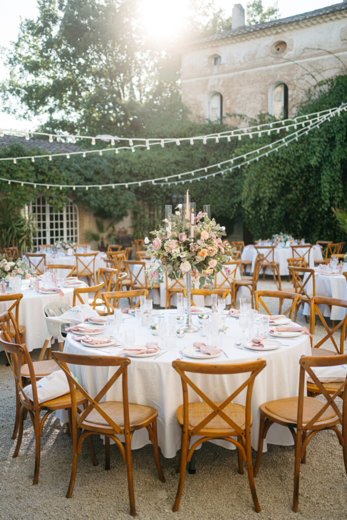 La journée a culminé avec un dîner somptueux sous le ciel étoilé de Provence. Les tables élégamment dressées, éclairées par des guirlandes lumineuses, ont créé une atmosphère intime et chaleureuse. Les convives ont savouré des mets délicieux tout en échangeant des rires et des anecdotes, tandis que le château en arrière-plan semblait veiller sur cette scène de bonheur partagé.