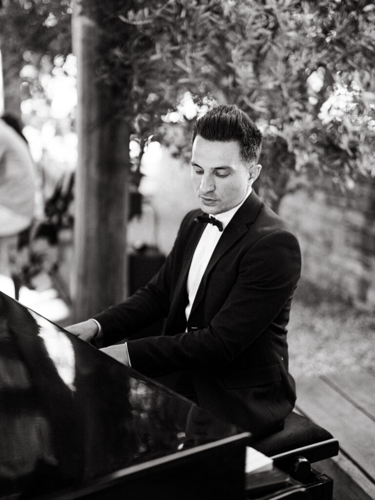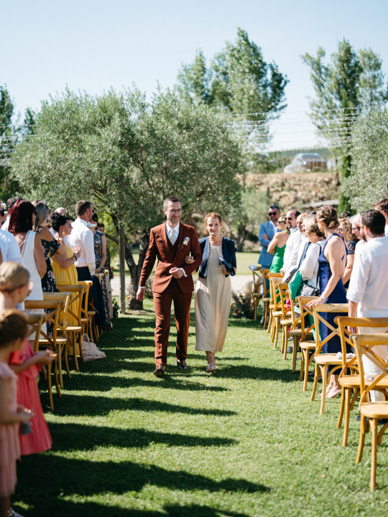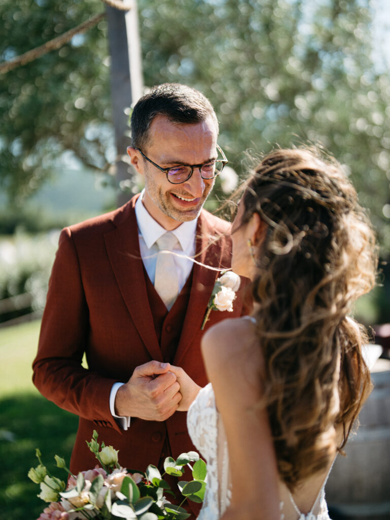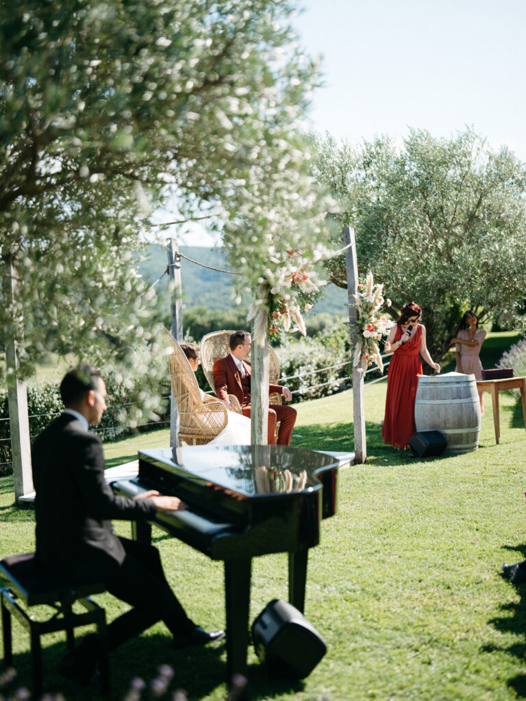 Le jour du mariage, la magie était au rendez-vous. Adeline et Sylvain ont échangé leurs vœux lors d’une cérémonie laïque intime sous les oliviers, avec un pianiste pour accompagner ce moment d’émotion pure.
