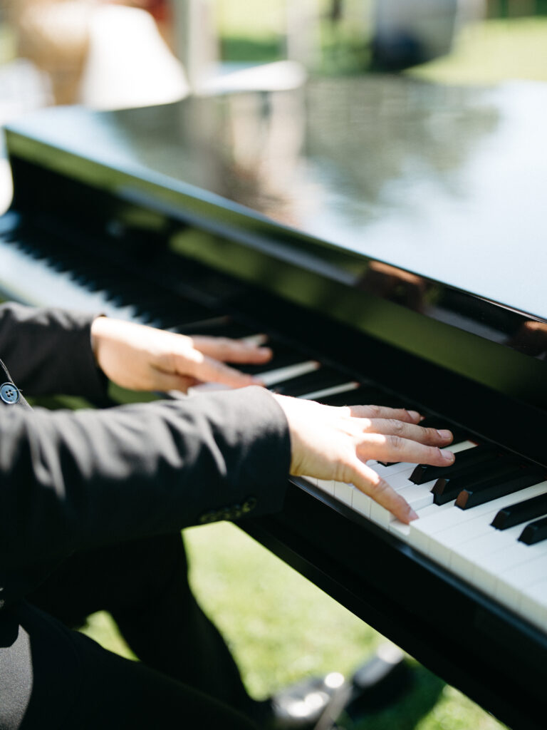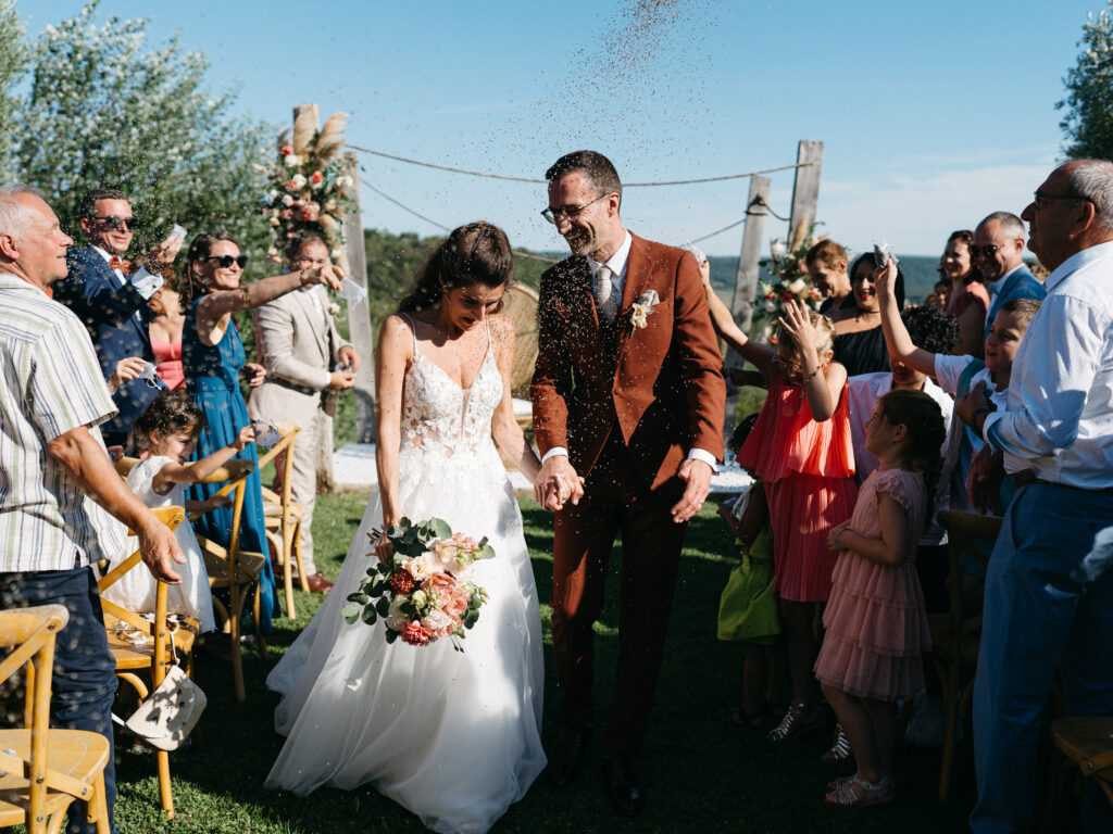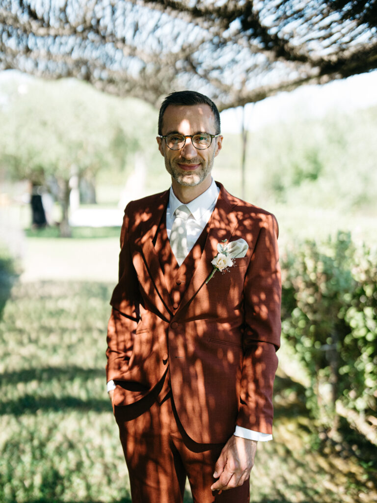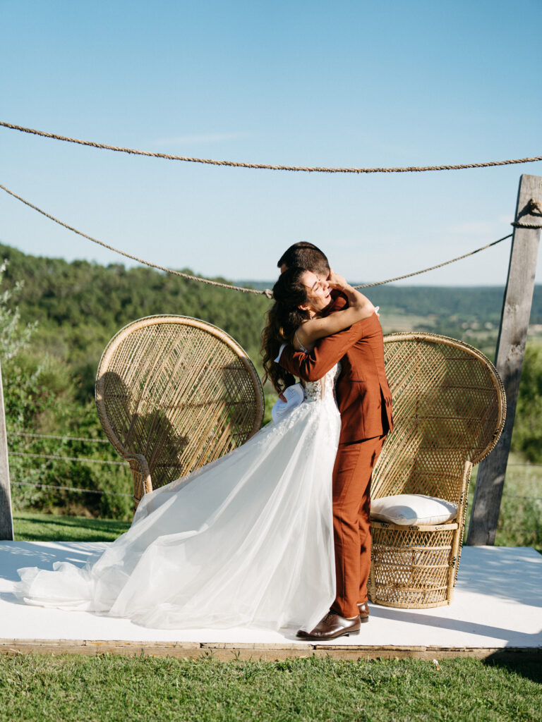 Le jour du mariage, la magie était au rendez-vous. Adeline et Sylvain ont échangé leurs vœux lors d’une cérémonie laïque intime sous les oliviers, avec un pianiste pour accompagner ce moment d’émotion pure.